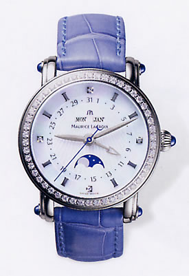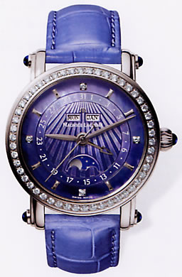 ダイヤル上の半円形の小窓内を動く神秘的なムーンフェイズ(月齢)の他に、この宝石のような時計は、日付・曜日・月表示を備えています。