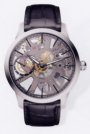 ムーブメント:モーリスラクロア自社製ムーブメント、手彫り装飾の手巻きスケルトンムーブメント、キャリバーML134、18,000振動、17石、PVD加工のブリッジとスクリュー、ポリッシュドスティールのアンクルとガンギ車、ちらネジ付き黄銅テンプ、インカブロック耐震装置