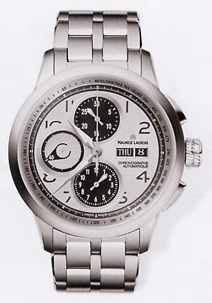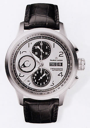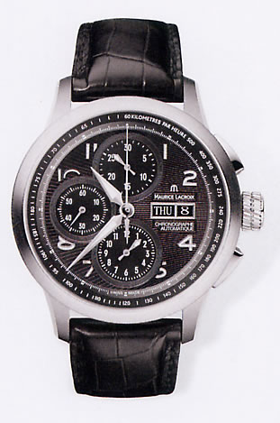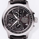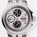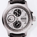 機能:30分計(12時位置)と12時間計(6時位置)を備えたクロノグラフ、曜日・日付表示(3時位置)、スモールセコンド(9時位置)、べセルにタキメータースケール