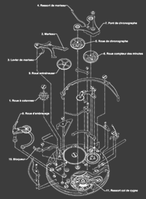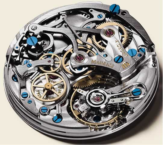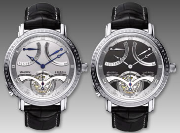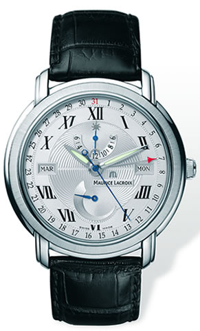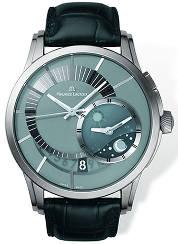 日時を可能な限り文字盤レベルに配するために、ベースムーブメントと複雑モジュールの連結をモーリス・ラクロア自社内で開発し、現在特許申請中