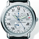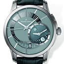 ダイヤルの中央には、洗練されたギョシェ模様を施し、その外周に時間を表示するローマンインデックスが、さらに外側トラックに日付表示が配されています。日付は即座に読み取れるようポインターデイト針の先端を赤色塗布しました。曜日と月は、3時と9時位置の2箇所の小窓に表示。パワーリザーブ表示は6時位置に配置され、下方に向かってだんだん細くなるスタイリッシュ鎌の刃のデザインになっています。セカンドタイムゾーンは12時位置にブルースティール針で表示され、一つの先端には太陽、もう一方の先端には月を掲げています。このスモールダイヤルは朝の6時から夜の6時までと、夜の6時から朝の6時までを表示し、これにより、デイタイムの12時間ナイトタイムの12時間かを見分けることが可能です。
