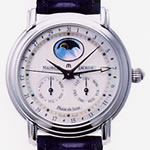 そして、何よりもユニークなのは12時の位置のオーバル型ムーンフェイズ。ブルーに輝くマザーオブパールの雲から丸みを帯びてライトアップされたゴールドの月と星が覗く様子は、思わず目を引く美しさです。曜日と月のインダイヤルにも中心から波紋のように広がるギョーシェ彫りをあしらい、細部まで丁寧に仕上げたクラシカルでいて斬新な限定モデル。クロコダイル革のストラップもダークブルーと、こだわっています。