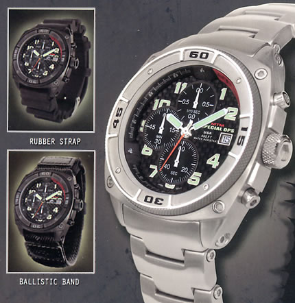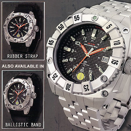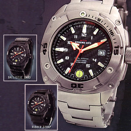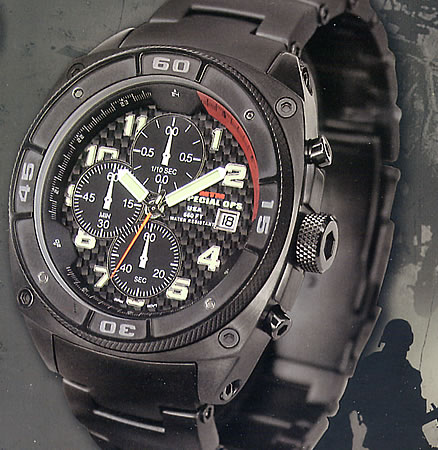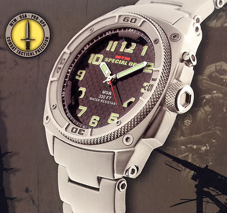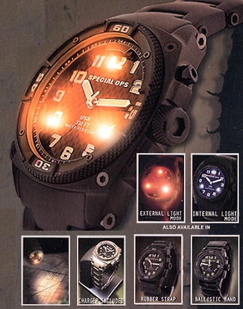現役兵士から過酷な状況下での任務を遂行させる時計として要請され、完成したMTM SPECIAL OPSは、タイムキーパー以外の機能にもこだわりを見せている。電磁誘導式非接触充電クオーツ スペシャルオプス ホーク1マイルまで届くトーチライト級のエクストラライトモードでは、暗闇での地図の確認や、通信手段として使用できます。美しいブルーに輝く、バックライトモードは、文字盤を鮮明に照射し、暗闇でも瞬時に時間を読み取るLED。