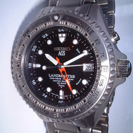 7大陸最高峰を目指す冒険家、野口健、ロシア北極海単独歩行180kmなどを成功させている日本が誇る世界の探検家、大場満郎たちが、生死の堺を潜り抜ける過酷な冒険のパートナーとして厳しい選択眼で選んで使用しているのがSEIKOランドマスターです。時計を振ることにより、内蔵された発電機を回し電源とするセイコー独自のキネティックAGSシステム(電池交換がいらないクオーツ)で、短針が単独で動かせる機構で、24時間時計がディアルタイム(世界時間)として使えます。その24時間時計を太陽に向かって指せば、即方位がわかる方■計ベゼル搭載の機能性抜群の優秀なアウトドアーウォッチです。カレンダー連動時差修正機能、無反射コーティングサファイヤガラス、オールチタンは強く、屈強、アレルギーの心配もありません。