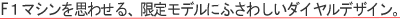 Racing F1 Team LMITED EDITlON』モデルとは異なるホワイトダイヤルカラーは、Hondaが1964年に初めてF1に参戦した時のマシン「RA271」をイメージしている。 ダイヤル、裏ぶた、そして専用ボックスには、LIMITED