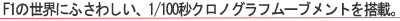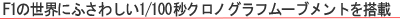 Redに染められた針は10ケ所の目盛り全てにしっかりと止まりながら回転し、1秒間に100回のストップ&ゴーを繰り返す。その動きはあまりにも速すぎるため、肉眼では捉えることはできない。しかし、スピードを競うF1の世界と同じく見る者の心を捉えるだろう。