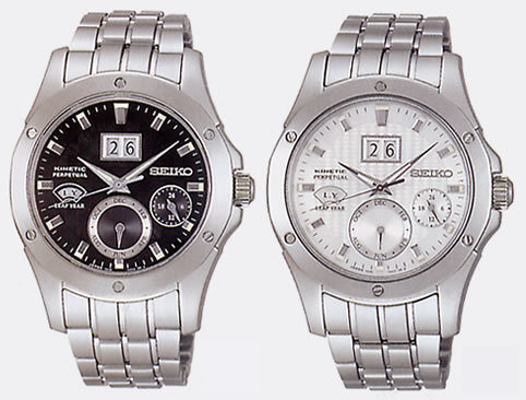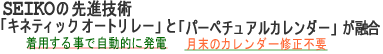 特徴 この時計は電池交換やカレンダー修正、長期(最長4年)不使用後からの自動時刻復帰など、使う方の手間を極限まで解消した実用性の高いモデルです。着用することで自動的に発電 自動巻き発電クォーツ「キネティック」を搭載。腕のわずかな動きにより、発電および充電を行い駆動します。従って、電池交換が不要です。不使用時はエネルギーをセーブ、使うときには自動で復活 「オートリレー」機能はパワーセーブ及び自動時刻復帰が可能。約24時間放置すると、カレンダーを除く、時・分・秒針が自動的に停止するパワーモードに入り、再び使う時には時計を数回振ることで、自動的に現在時刻に復帰します。月末のカレンダー修正不要 大の月、小の月、うるう年に関わらず、正しい日付を表示します。(2100年2月28日まで。)また、「キネティック パーペチュアル」はパワーセーブ時(時・分・秒針が停止している状態)もカレンダーを送りつづけるので、時刻復帰時にも正しい日時(月・日・時・分・秒)が表示されます。多彩なカレンダー表示 9時位置の扇形の窓はうるう年からの経過年数を表示。うるう年は「LY」(Leap
