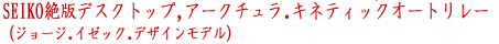 イタリアのスーパーデザイナージョージ・イゼックがデザイン、SEIKOとのコラボレーションモデル!電池交換不要の国産最先端テクノロジー機構、キネティック搭載!その進化バージョンのオートリレー機能のスペシャルキネティックで、フル充電から約4年間、針が止まっている状態でも、時計を数回振るだけで、現在の時刻を即座に表示!のすぐれ物です!